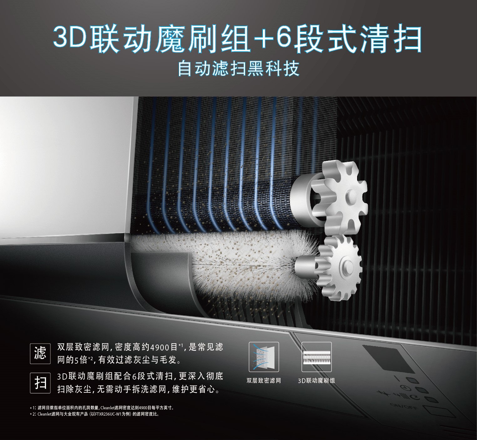 3D聯(lián)動(dòng)魔刷組匹配6段式清掃,自動(dòng)濾掃黑科技實(shí)現空調常用常新